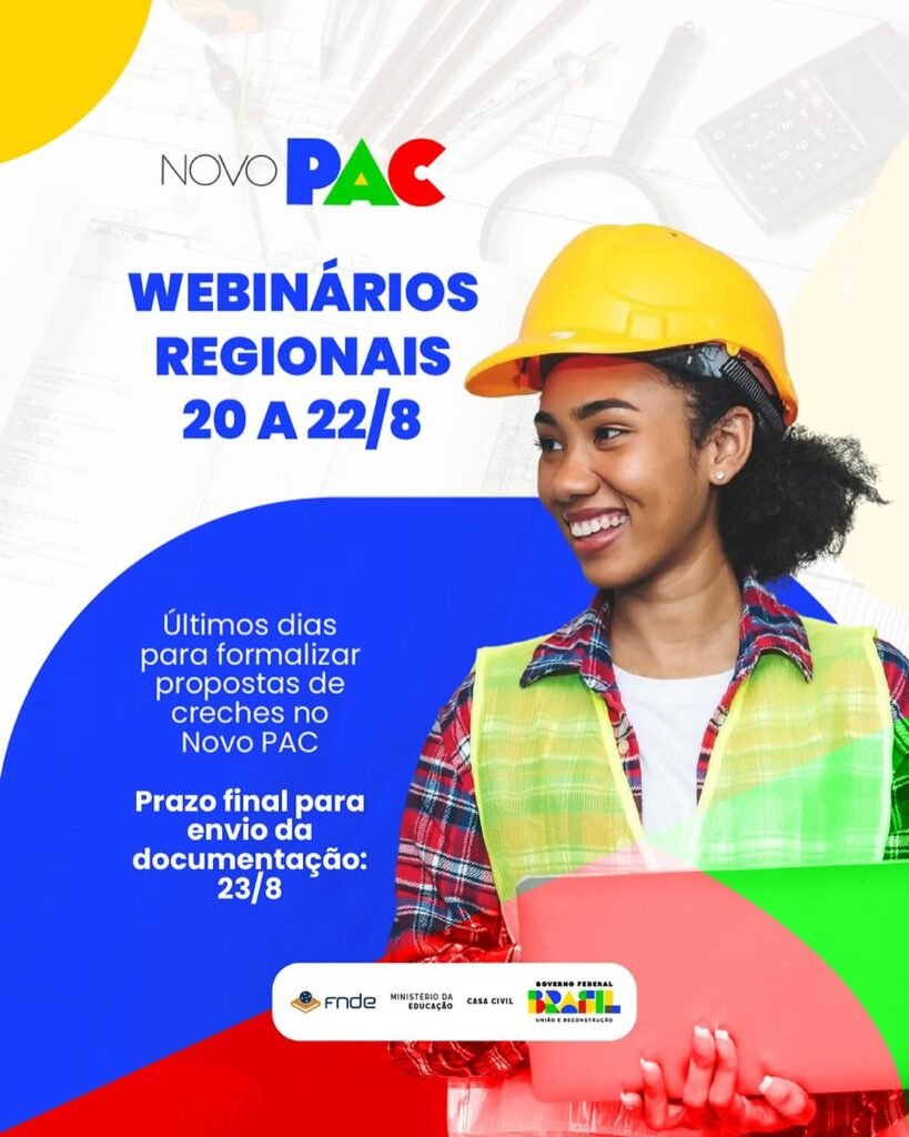 O Fundo Nacional de Desenvolvimento da Educação (FNDE), autarquia vinculada ao Ministério da Educação (MEC), realizará, de 20 a 22 de agosto, cinco webinários — um para cada região do país — com orientações voltadas aos municípios selecionados na segunda etapa do Novo Programa de Aceleração do Crescimento (Novo PAC).